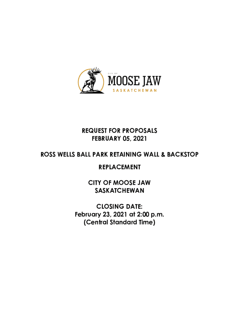 REQUEST FOR PROPOSALS FEBRUARY 05, 2021, ROSS WELLS BALL PARK RETAINING WALL & BACKSTOP REPLACEMENT CITY OF MOOSE JAW SASKATCHEWAN CLOSING DATE: February 23, 2021, at 2:00 p.m. (Central Standard Time)Table