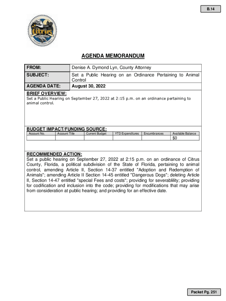 B.14AGENDA MEMORANDUM FROM:Denise A. Demand Lynn, County AttorneySUBJECT:Set a Public Hearing on an Ordinance Pertaining to Animal Control August 30, 2022AGENDA DATE: BRIEF OVERVIEW:Set a Public Hearing