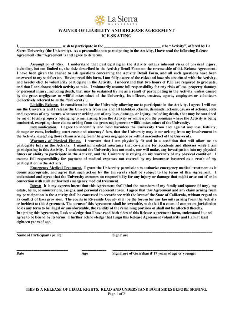 WAIVER OF LIABILITY AND RELEASE AGREEMENT ICE SKATING I, ___ wish to participate in the ___ (the Activity) offered by La Sierra University (the University). As a precondition to participating in the