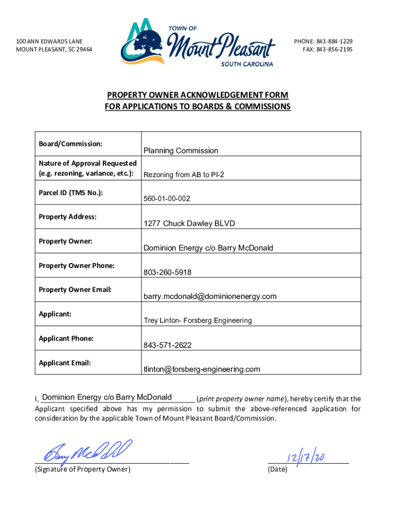 100 ANN EDWARDS LANE MOUNT PLEASANT, SC 29464PHONE: 8438841229 FAX: 8438562195PROPERTY OWNER ACKNOWLEDGEMENT FORM FOR APPLICATIONS TO BOARDS & COMMISSIONSBoard/Commission:Planning Commissionaire of