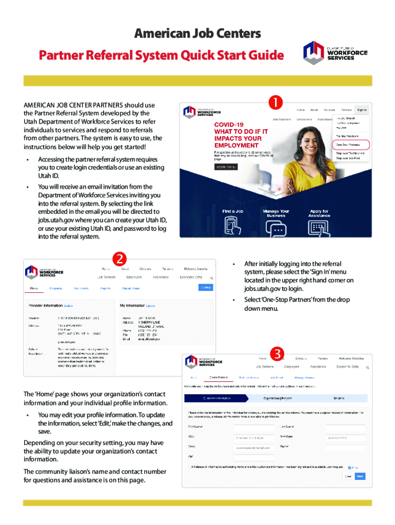 American Job Centers Partner Referral System Quick Start mid-American JOB CENTER PARTNERS should use the Partner Referral System developed by the Utah Department of Workforce Services to refer individuals