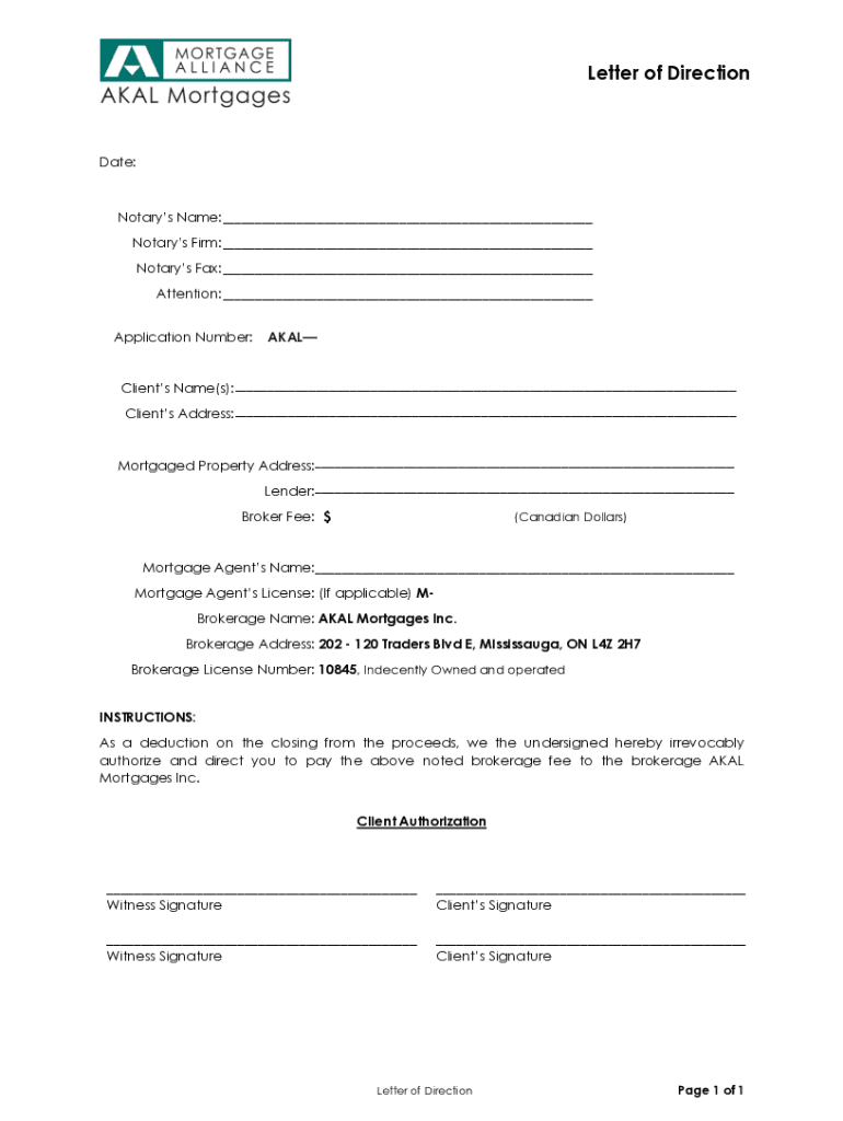 Letter of Directional:Notaries Name:___ Notaries Firm:___ Notaries Fax:___ Attention:___ Application Number:AKALClients Name(s):___ Clients Address:___ Mortgaged Property Address:___ Lender:___ Broker