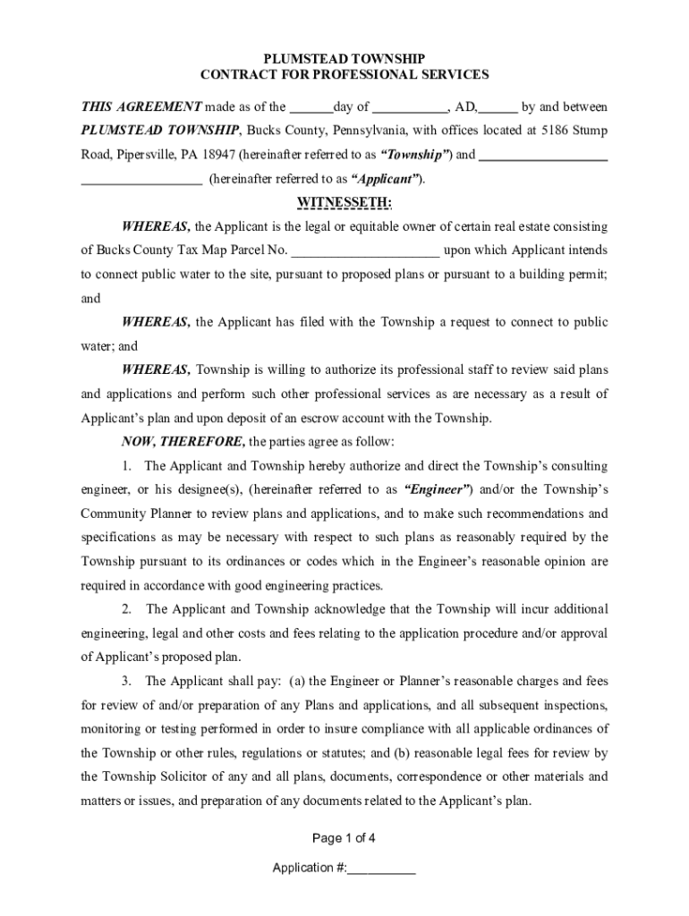 OLMSTEAD TOWNSHIP CONTRACT FOR PROFESSIONAL SERVICES THIS AGREEMENT made as of the day of, AD, by and betweenPLUMSTEAD TOWNSHIP, Bucks County, Pennsylvania, with offices located at 5186 Stump Road,
