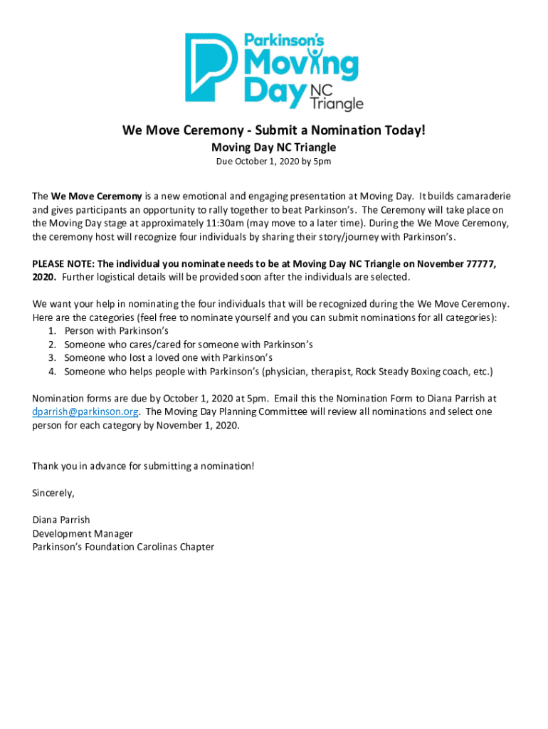 We Move Ceremony Submit a Nomination Today! Moving Day NC Triangle Due October 1, 2020, by 5pmThe We Move Ceremony is a new emotional and engaging presentation at Moving Day. It builds camaraderie