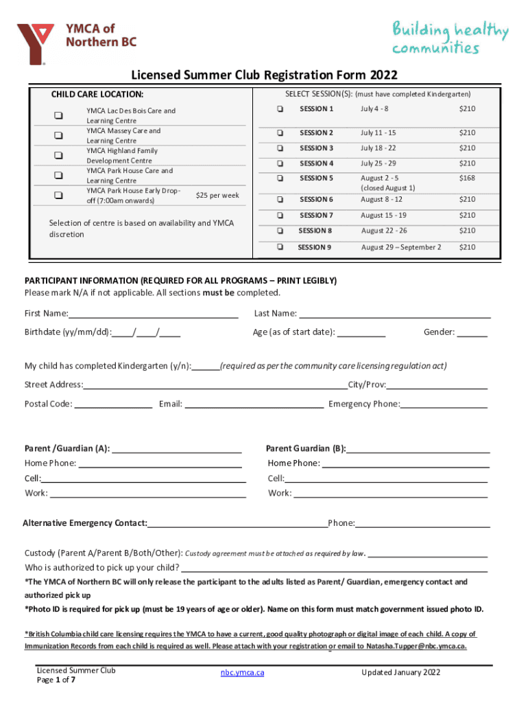 Licensed Summer Club Registration Form 2022 CHILD CARE LOCATION: SELECT SESSION(S): (must have completed Kindergarten)YMCA Lac DES Boys Care and Learning Center YMCA Massey Care and Learning Center