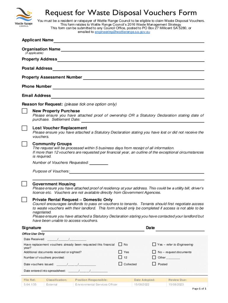 Request for Waste Disposal Vouchers Form You must be a resident or ratepayer of Wattle Range Council to be eligible to claim Waste Disposal Vouchers. This form relates to Wattle Range Councils 2016
