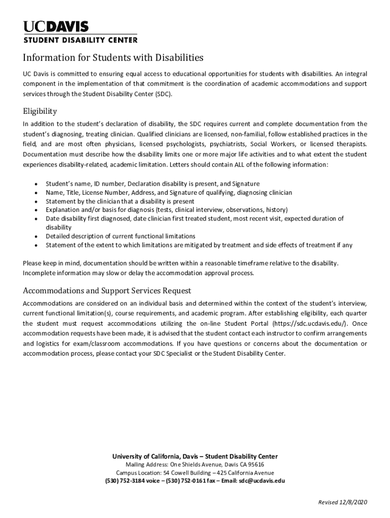 Information for Students with Disabilities UC Davis is committed to ensuring equal access to educational opportunities for students with disabilities. An integral component in the implementation of