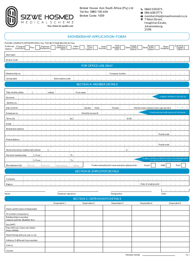 Broker House: Aon South Africa (Pty) Ltd Tel No: 0860 100 404 Broker Code: 10090860 100 871 086 608 0771 membership@sizwehosmed.co.za 7 West Street, Houghton Estate, Johannesburg, 2198MEMBERSHIP APPLICATION