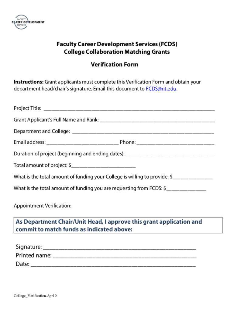 Faculty Career Development Services (CDs) College Collaboration Matching Grants Verification Form Instructions: Grant applicants must complete this Verification Form and obtain your department head/chairs