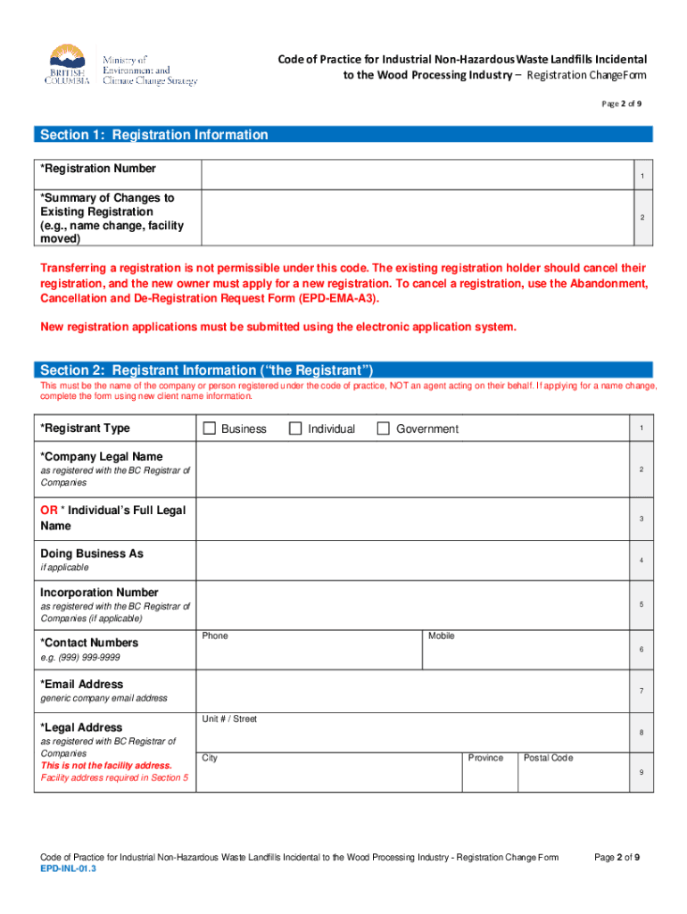 Registration Change Form for authorization to discharge waste under the Environmental Management Accede of Practice for Industrial Nonhazardous Waste Landfills Incidental to the Wood Processing Industry