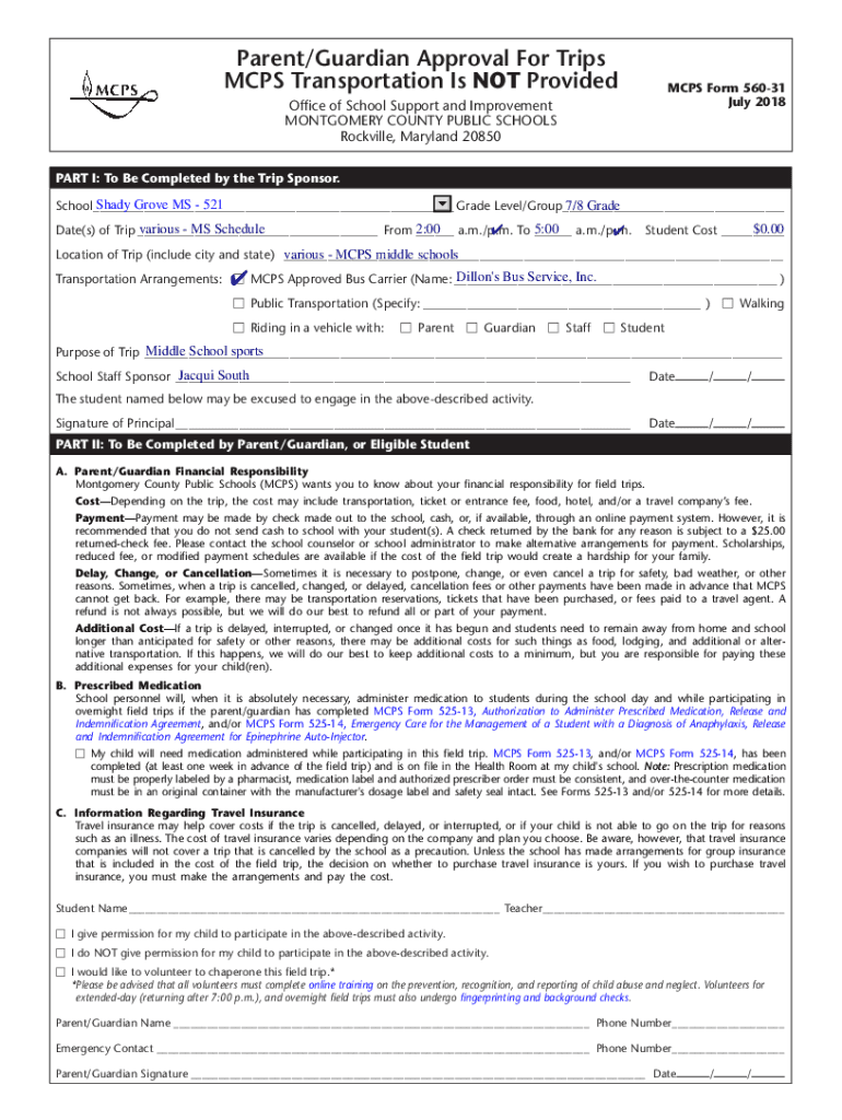 Parent/Guardian Approval For Trips MCPS Transportation Is NOT Provided Office of School Support and Improvement MONTGOMERY COUNTY PUBLIC SCHOOLS Rockville, Maryland 20850MCPS Form 56031 July 2018PART