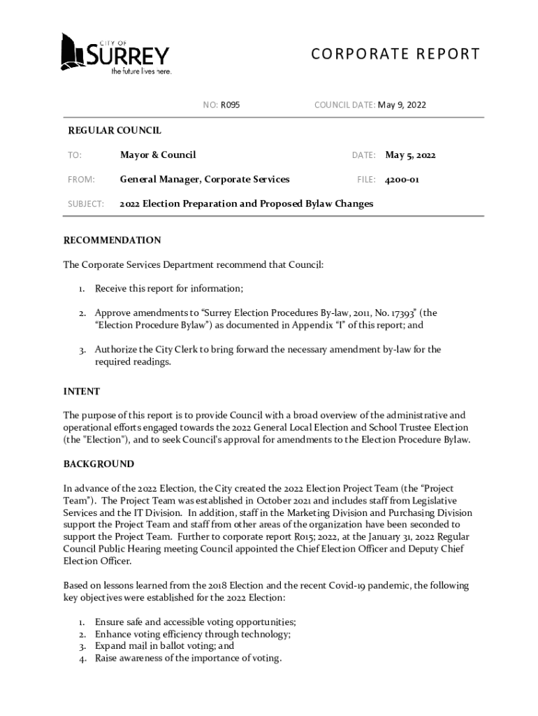 CORPORATE REPORT NO: R095COUNCIL DATE: May 9, 2022REGULAR COUNCIL TO:Mayor & Conciliate: May 5, 2022FROM:General Manager, Corporate ServicesSUBJECT:2022 Election Preparation and Proposed Bylaw Changeable:
