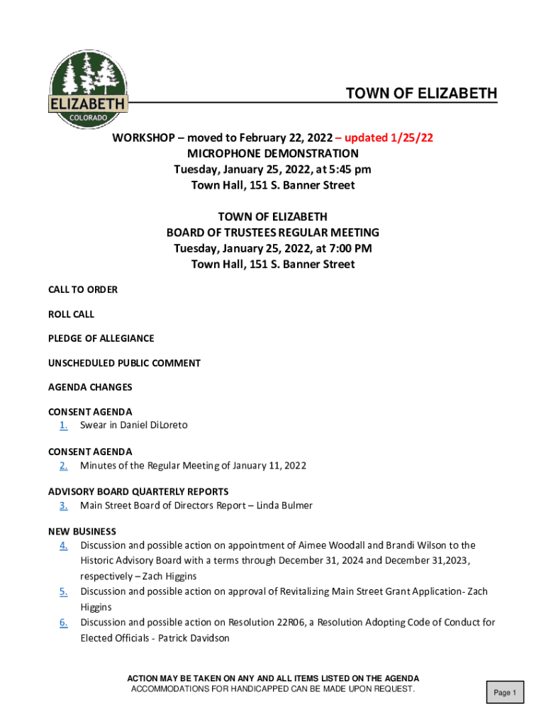 TOWN OF ELIZABETH WORKSHOP moved to February 22, 2022, updated 1/25/22 MICROPHONE DEMONSTRATION Tuesday, January 25, 2022, at 5:45 pm Town Hall, 151 S. Banner Street TOWN OF ELIZABETH BOARD OF TRUSTEES