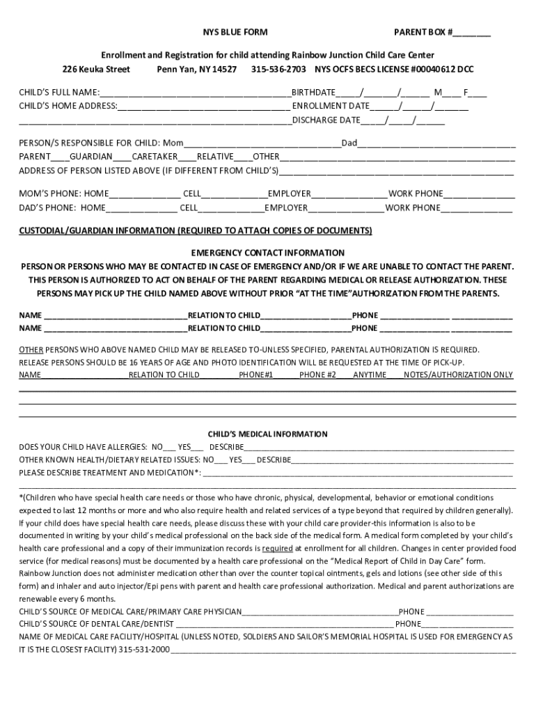 NYS BLUE FIRMAMENT BOX #___Enrollment and Registration for child attending Rainbow Junction Child Care Center 226 Kenya Street Penn An, NY 14527 3155362703 NYS OFFS BECS LICENSE #00040612 DCC CHILD