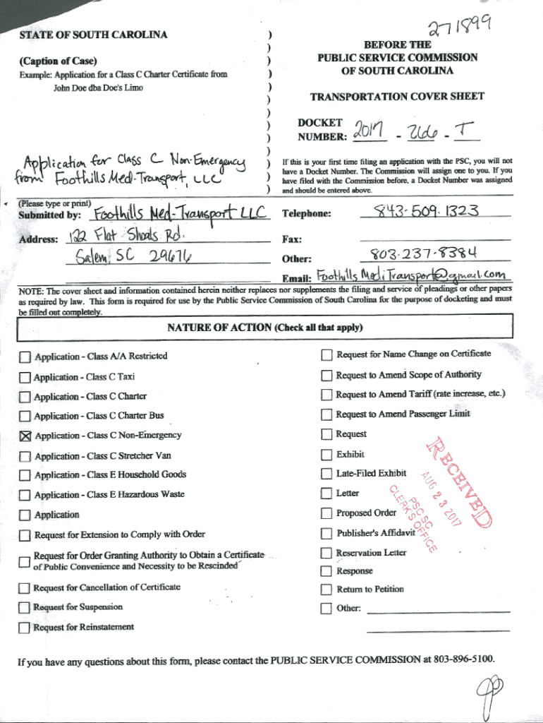 STATE OF SOUTH CAROLINABEFORE THE PUBLIC SERVICE COMMISSION OF SOUTH CAROLINA)(Caption of Case))Example: Application for a Class C Chatter Certificate com John Doe DBA Doe\'s Limo))TRANSPORTATION