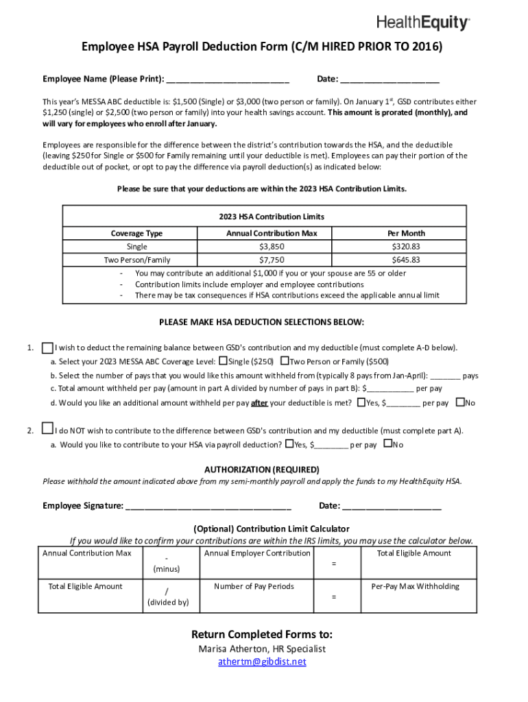 Employee HSA Payroll Deduction Form (C/M HIRED PRIOR TO 2016) Employee Name (Please Print): ___Date: ___This year's MESS ABC deductible is: $1,500 (Single) or $3,000 (two person or family). On January