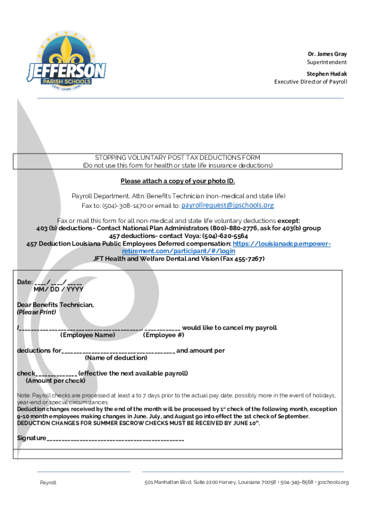 Dr. James Gray Superintendent Stephen Human Executive Director of PayrollSTOPPING VOLUNTARY POST TAX DEDUCTIONS FORM (Do not use this form for health or state life insurance deductions) Please attach