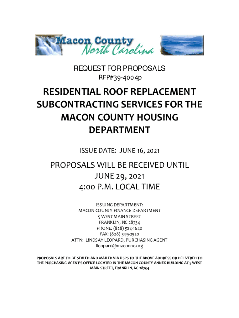 REQUEST FOR PROPOSALS RFP#394004pRESIDENTIALROOFREPLACEMENT SUBCONTRACTINGSERVICESFORTHE MACONCOUNTYHOUSING DEPARTMENT ISSUED ATE:JUNE16,2021 PROPOSALSWILLBERECEIVEDUNTIL JUNE29,2021 4:00P. M.LOCAL