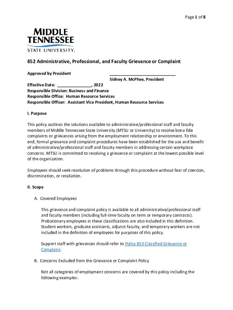 Page 1 of 8852 Administrative, Professional, and Faculty Grievance or Complaint Approved by President___ Sidney A. McGhee, PresidentEffective Date: ___, 2022 Responsible Division: Business and Finance