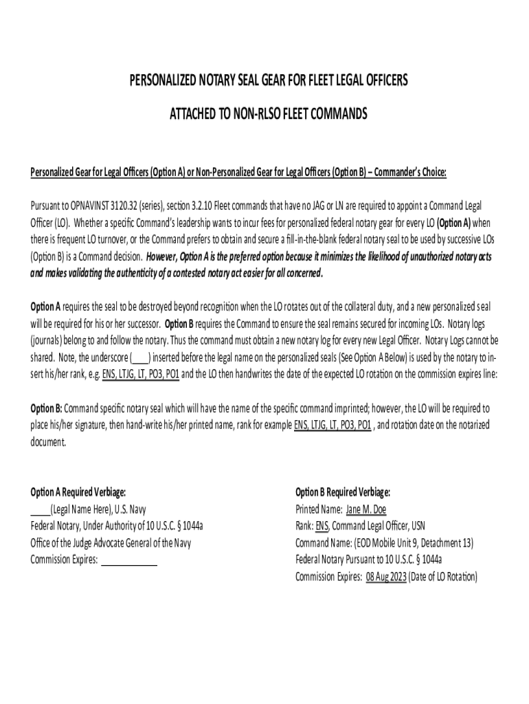 PERSONALIZED NOTARY SEAL GEAR FOR FLEET LEGAL OFFICERS ATTACHED TO NOVELS FLEET COMMANDS Personalized Gear for Legal Officers (Option A) or Personalized Gear for Legal Officers (Option B) Commanders
