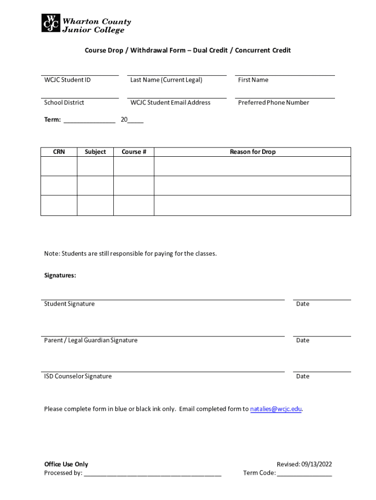 Course Drop / Withdrawal Form Dual Credit / Concurrent CreditWCJC Student The Idlest Name (Current Legal)First Homeschool DistrictWCJC Student Email AddressPreferred Phone Numbered: ___ 20___CRNSubjectCourse