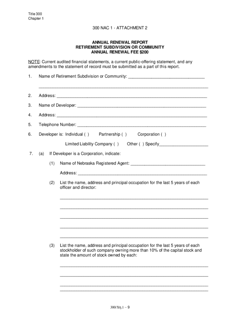 Title 300 Chapter 1300 NAC 1 ATTACHMENT 2ANNUAL RENEWAL REPORT RETIREMENT SUBDIVISION OR COMMUNITY ANNUAL RENEWAL FEE $200 NOTE: Current audited financial statements, a current public offering statement,