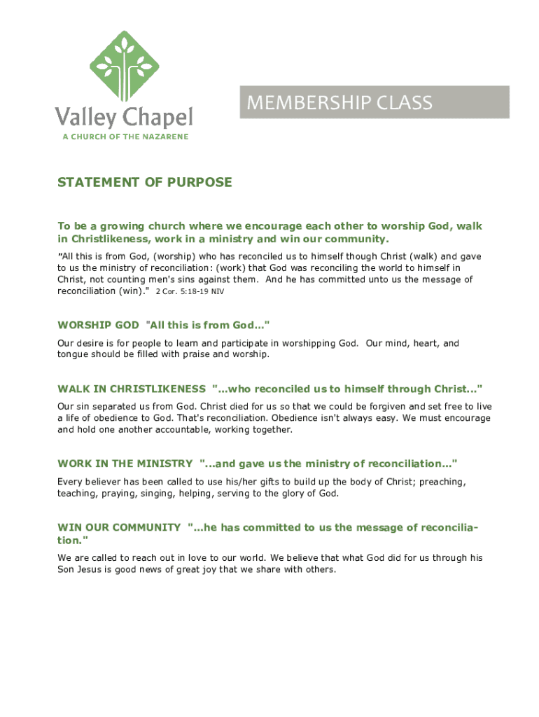 MEMBERSHIP CLASSSTATEMENT OF PURPOSE To be a growing church where we encourage each other to worship God, walk in Christ likeness, work in a ministry and win our community. \” All this is from God,
