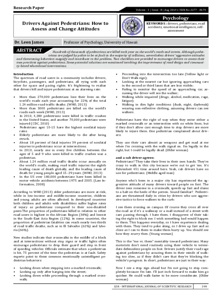 Research PaperVolume : 3 | Issue : 8 | Aug 2014 ISSN No 2277 8179PsychologyDrivers Against Pedestrians: How to Assess and Change Attitudes Dr. Leon JamesABSTRACTKEYWORDS : drivers, pedestrians, road