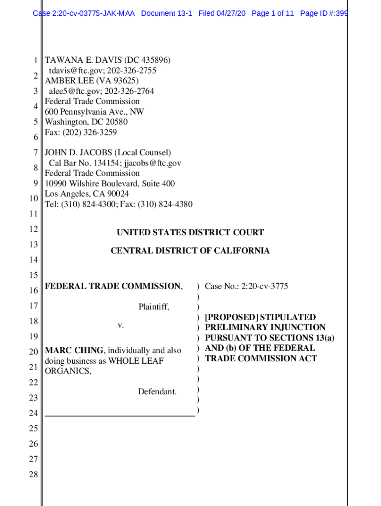 Case 2:20cv03775JAKMAA Document 131 Filed 04/27/20-Page 1 of 11-Page ID #:3991 TSWANA E. DAVIS (DC 435896) tdavis@ftc.gov; 2023262755 2 AMBER LEE (VA 93625) 3 alee5@ftc.gov; 2023262764 Federal Trade