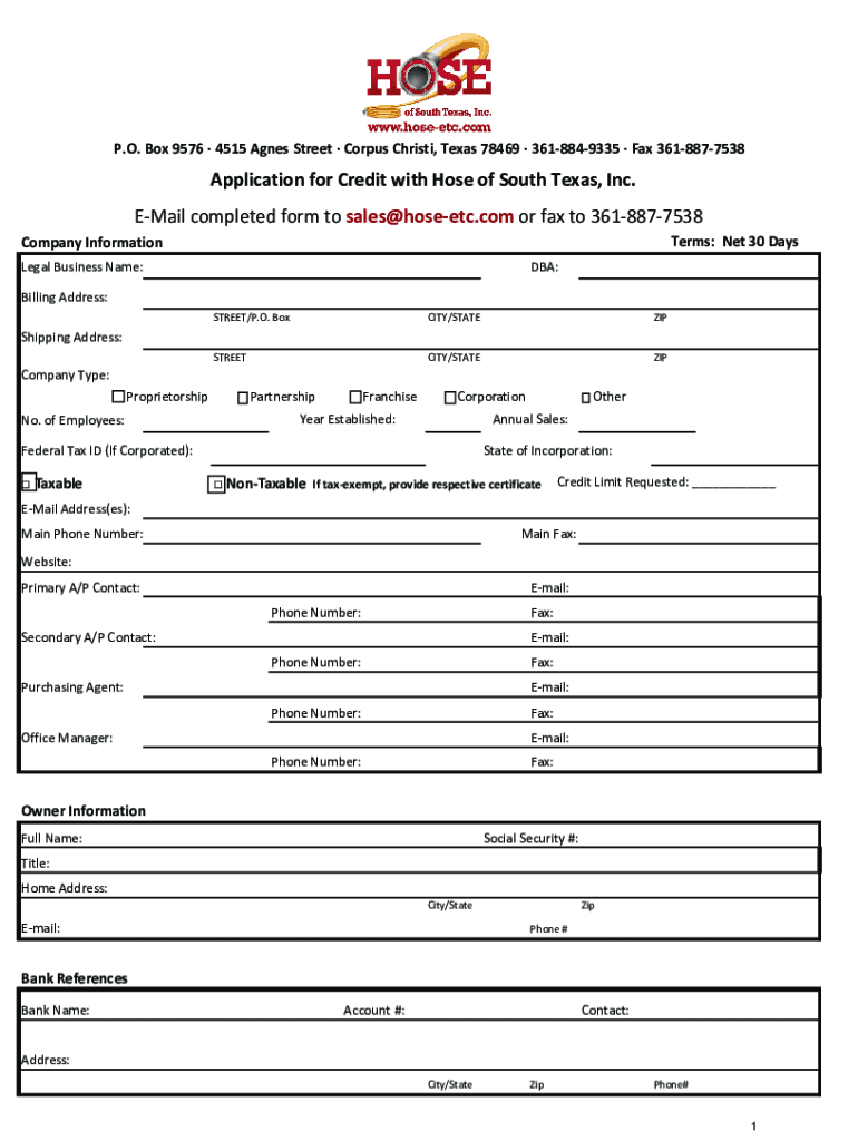 P.O. Box 9576 4515 Agnes Street Corpus Christi, Texas 78469 3618849335 Fax 3618877538Application for Credit with Hose of South Texas, Inc. Email completed form to sales@hoseetc.com or fax to 3618877538