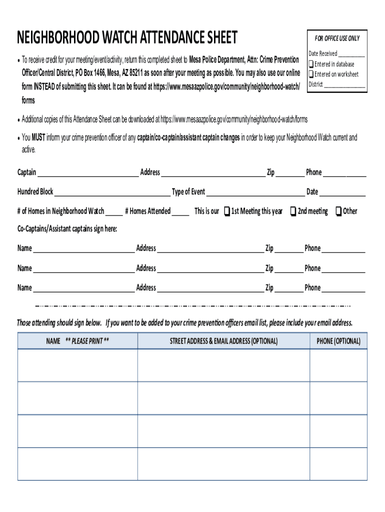 NEIGHBORHOOD WATCH ATTENDANCE SECTOR OFFICE USE ONLY Date Received ___ Entered in database Entered on worksheet District ___To receive credit for your meeting/event/activity, return this completed