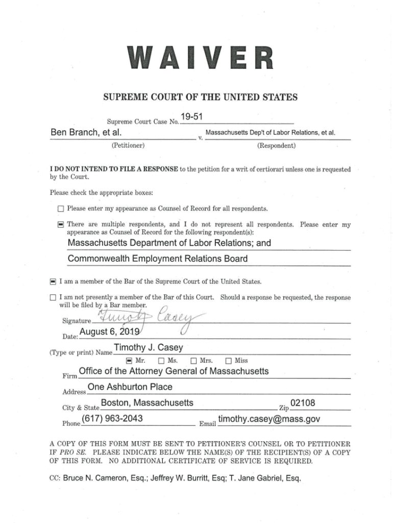 WAIVER SUPREME COURT OF THE United States Supreme Court Case No.1951Ben Branch, et al. Massachusetts DEP\'t of Labor Relations, et al.v.___ ;___ (Respondent)(Petitioner)I DO NOT INTEND TO FILE A RESPONSE
