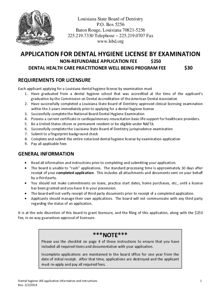 Louisiana State Board of Dentistry P.O. Box 5256 Baton Rouge, Louisiana 708215256 225.219.7330 Telephone 225.219.0707 Fax www.lsbd.orgAPPLICATION FOR DENTAL HYGIENE LICENSE BY EXAMINATION NONREFUNDABLE