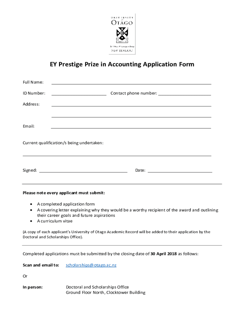 EY Prestige Prize in Accounting Application Form Full Name:___ID Number:___ Contact phone number: ___Address:___ ___Email:___Current qualification/s being undertaken: ___ Signed: ___Date: ___Please