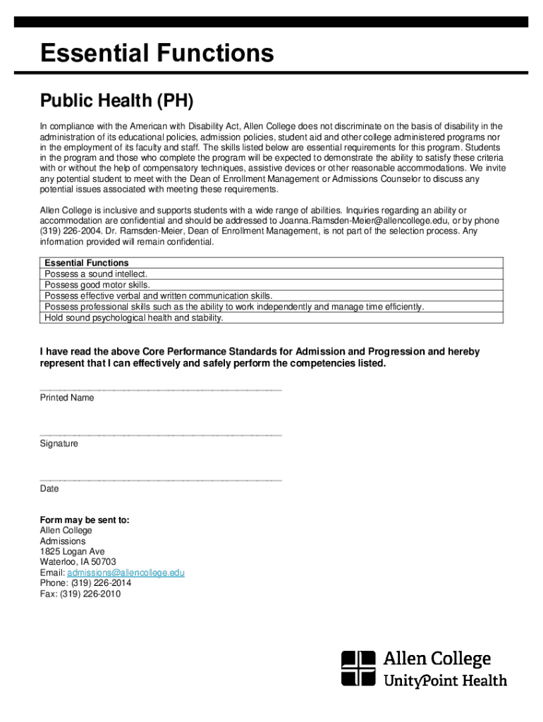 Essential Functions Public Health (PH) In compliance with the American with Disability Act, Allen College does not discriminate on the basis of disability in the administration of its educational