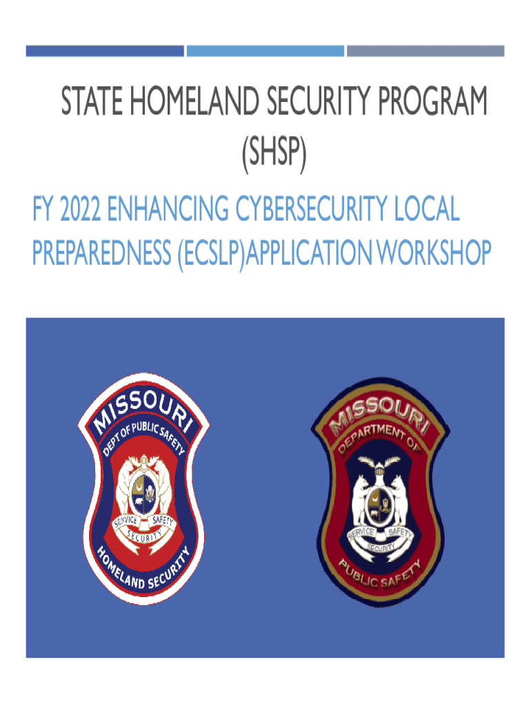 STATE HOMELAND SECURITY PROGRAM (SHIP) FY 2022 ENHANCING CYBERSECURITY LOCAL PREPAREDNESS (EC SLP)APPLICATION WORKSHOPMISSOURI OFFICE OF HOMELAND SECURITY NOTICE OF FUNDING OPPORTUNITY We are pleased