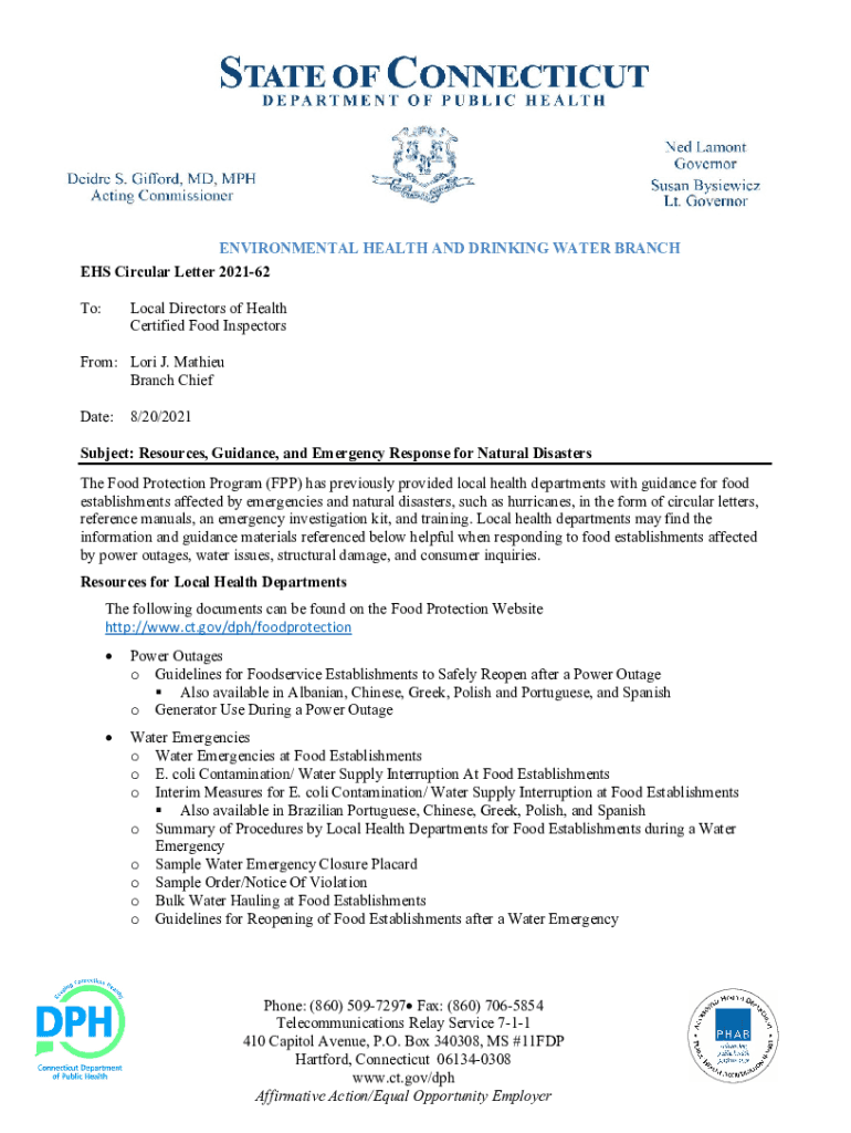 ENVIRONMENTAL HEALTH AND DRINKING WATER BRANCH EHS Circular Letter 202162 To:Local Directors of Health Certified Food InspectorsFrom: Lori J. Mathieu Branch Chief Date:8/20/2021Subject: Resources,