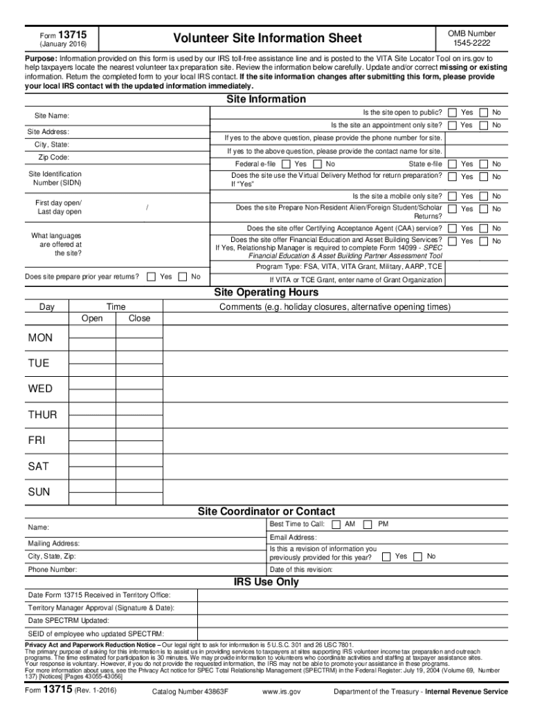 Form 13715 (January 2016)OMB Number 15452222Volunteer Site Information SheetPurpose: Information provided on this form is used by our IRS toll-free assistance line and is posted to the VITA Site Locator