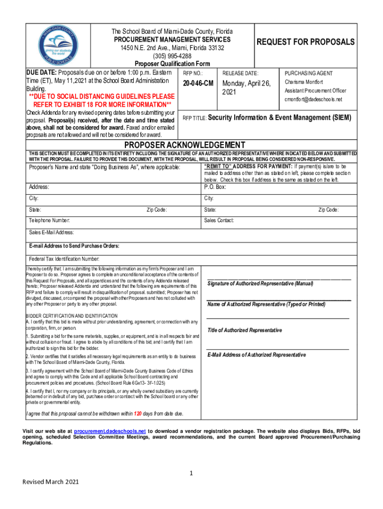 Set Forsythe School Board of Miami-Dade County, Florida PROCUREMENT MANAGEMENT SERVICES REQUEST FOR PROPOSALS 1450 N.E. 2nd Ave., Miami, Florida 33132 (305) 9954288 Proposer Qualification Form DUE