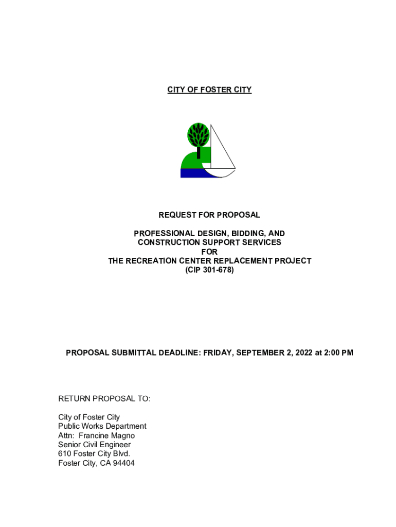 CITY OF FOSTER CITYREQUEST FOR PROPOSAL PROFESSIONAL DESIGN, BIDDING, AND CONSTRUCTION SUPPORT SERVICES FOR THE RECREATION CENTER REPLACEMENT PROJECT (CIP 301678)PROPOSAL SUBMITTAL DEADLINE: FRIDAY,