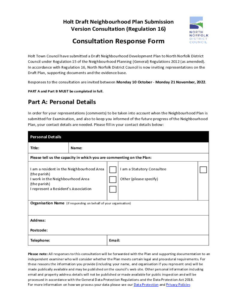 Holt Draft Neighborhood Plan Submission Version Consultation (Regulation 16)Consultation Response Form Holt Town Council have submitted a Draft Neighborhood Development Plan to North Norfolk District