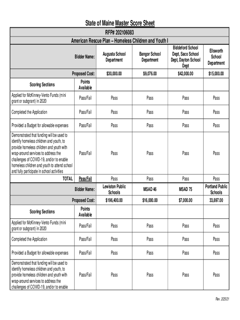 State of Maine Master Scoresheet RFP# 202106083 American Rescue Plan Homeless Children and Youth I Bidder Name: Proposed Cost:Augusta School Department Bangor School Department$$30,000.009,076.00Biddeford