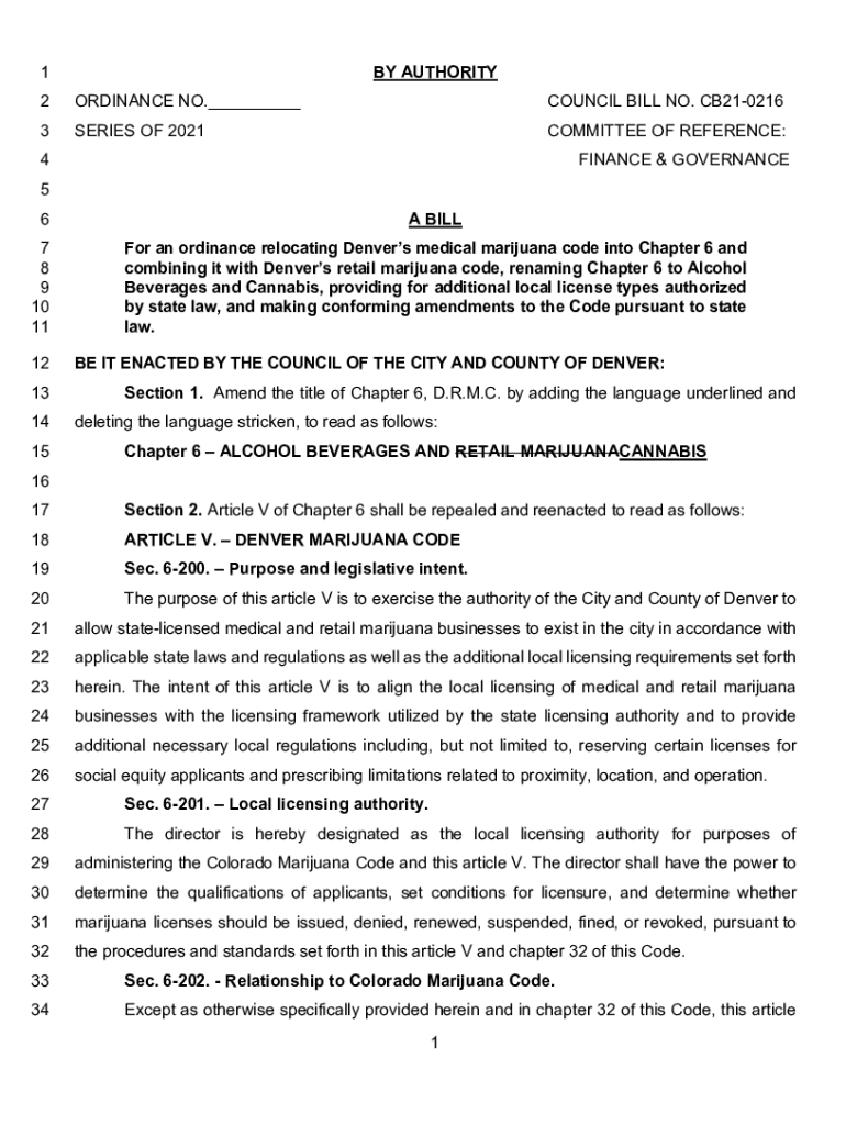 BY AUTHORITY1 2ORDINANCE NO.___COUNCIL BILL NO. CB2102163SERIES OF 2021COMMITTEE OF REFERENCE:4FINANCE & GOVERNANCE5 6A BILL7 8 9 10 11For an ordinance relocating Denver's medical marijuana code into