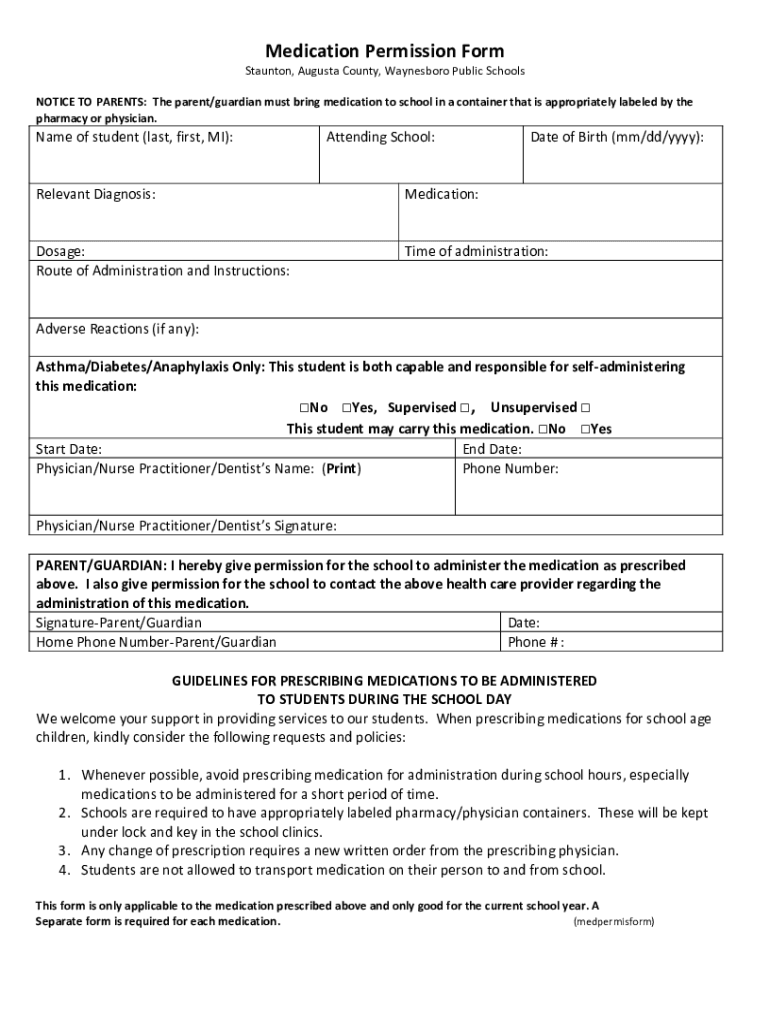 Medication Permission Form Staunton, Augusta County, Waynesboro Public SchoolsNOTICE TO PARENTS:The parent/guardian must bring medication to school in a container that is appropriately labeled by