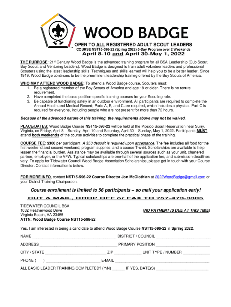 OPEN TO ALL REGISTERED ADULT SCOUT LEADERS COURSE NST1559622 (Spring 2022) 5Day Program over 2 Weekends April 810 and April 30May 1, 2022 THE PURPOSE: 21st Century Wood Badge is the advanced training
