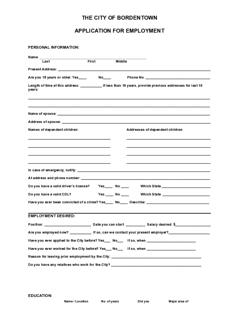 THE CITY OF BRENTON APPLICATION FOR EMPLOYMENT PERSONAL INFORMATION: Name: ___ Last First Middle Present Address: ___ Are you 18 years or older: Yes___No___Phone No. ___Length of time at this address: