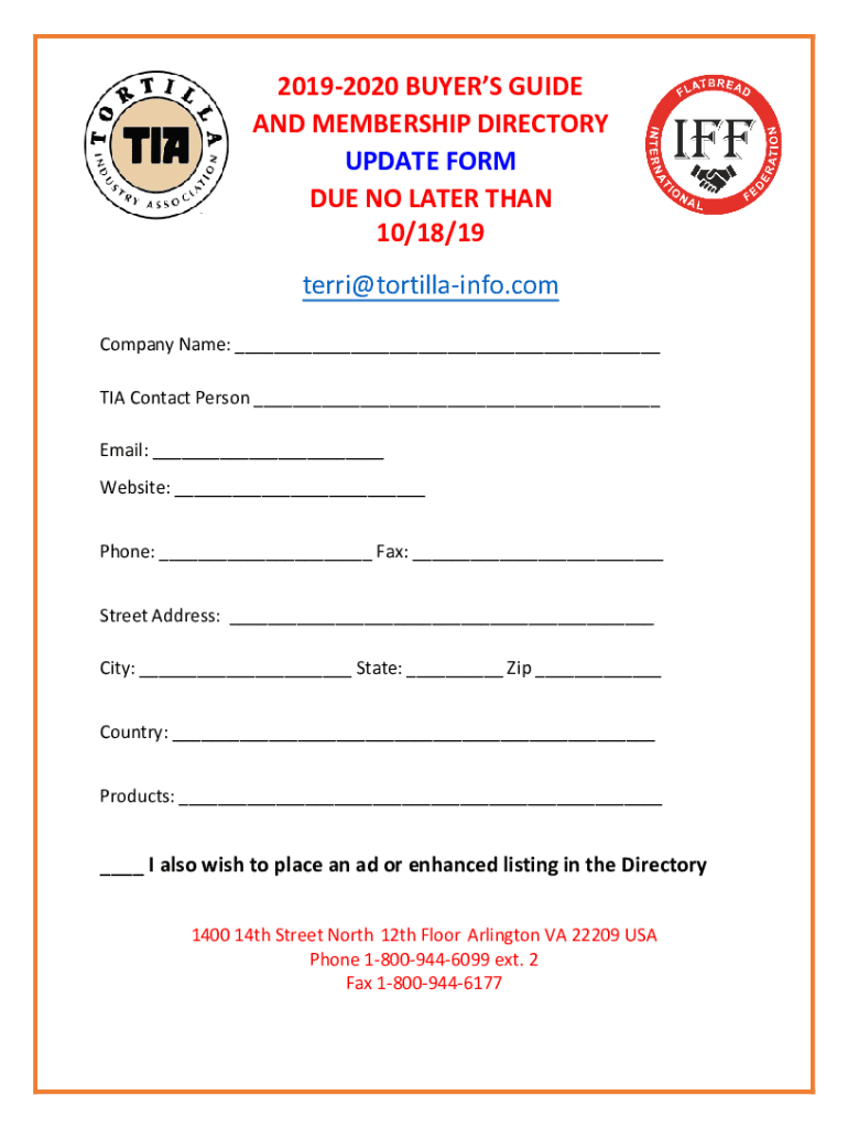 20192020 BUYERS GUIDE AND MEMBERSHIP DIRECTORY UPDATE FORM DUE NO LATER THAN 10/18/19 terri@tortillainfo.com Company Name: ___ TIA Contact Person ___ Email: ___ Website: ___ Phone: ___ Fax: ___ Street