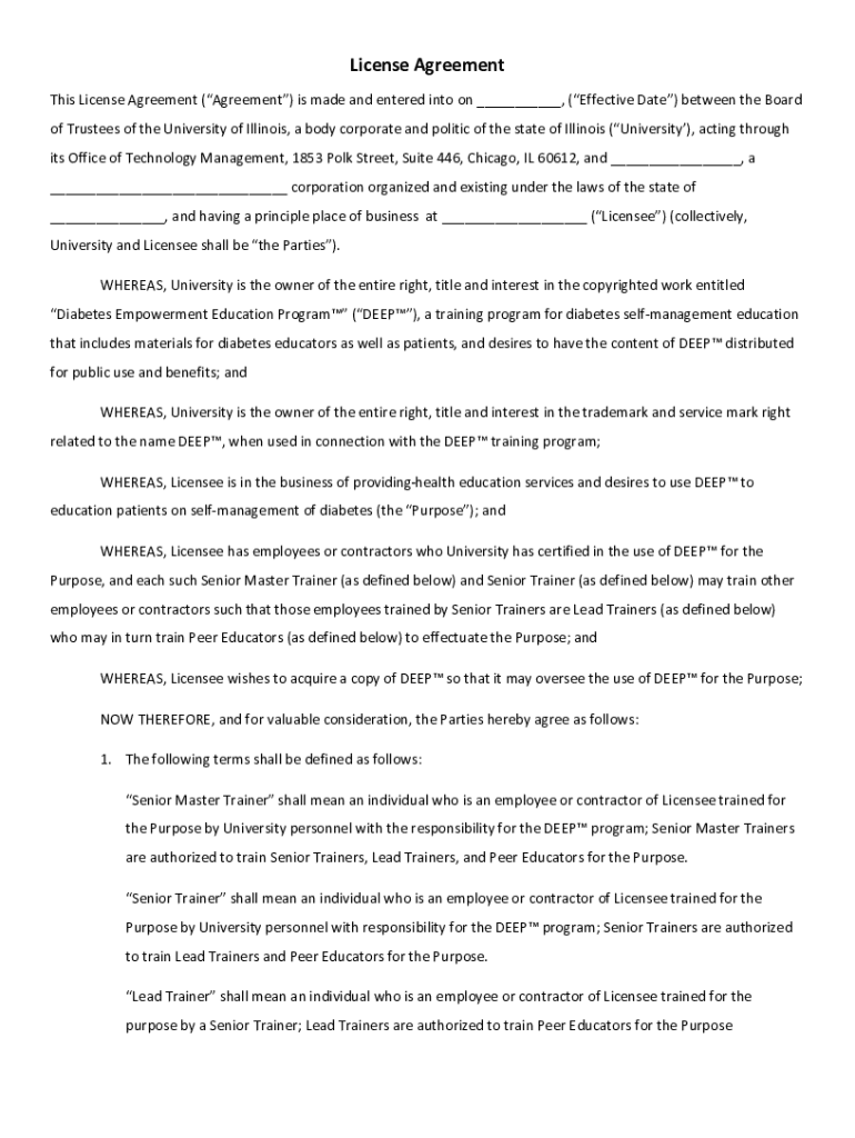 License Agreement This License Agreement (Agreement) is made and entered into on ___, (Effective Date) between the Board of Trustees of the University of Illinois, a body corporate and politic of