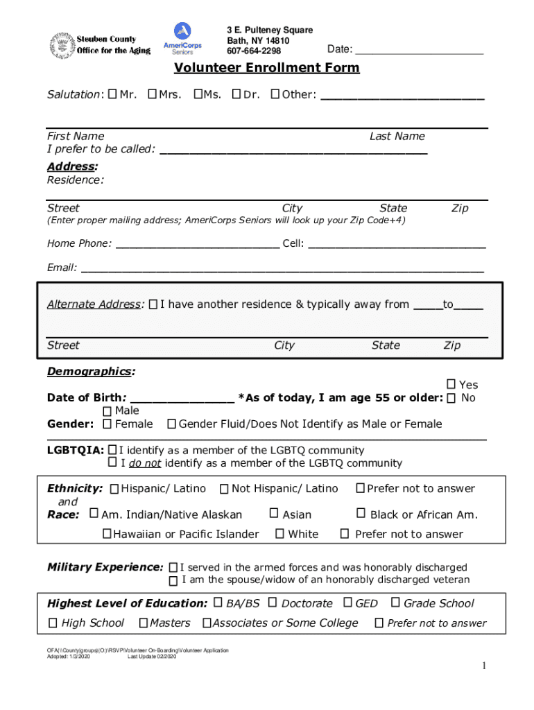 3 E. Sultana Square Bath, NY 14810 6076642298Date: ___RSVP@co.steuben Volunteer Enrollment Form.NY.salutation:Mr. Mrs. Ms. Dr. Other: ___First Name Last Name I prefer to be called: ___ Address: Residence: