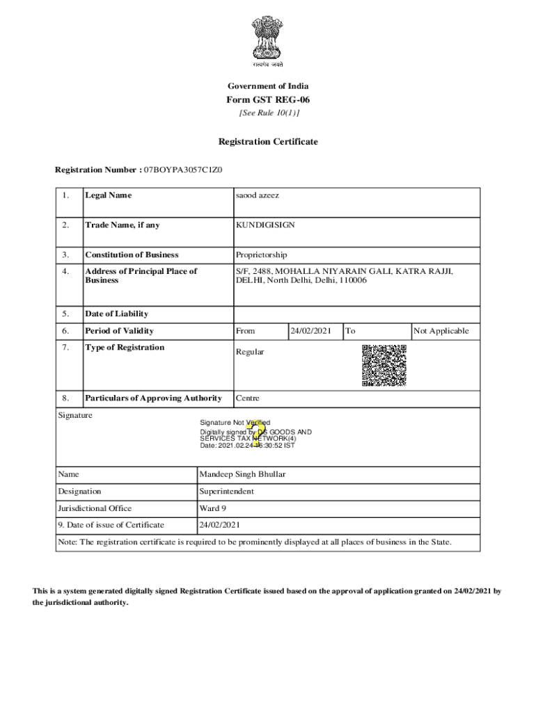 1. Legal Namesake azeez2. Trade Name, if anyKUNDIGISIGN3. Constitution of BusinessProprietorship4.